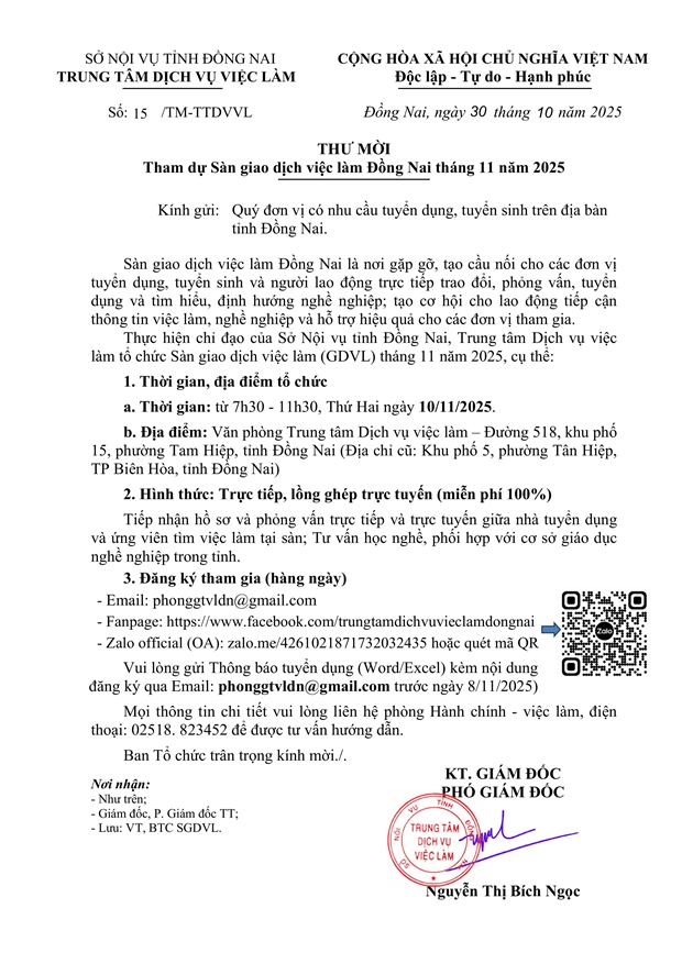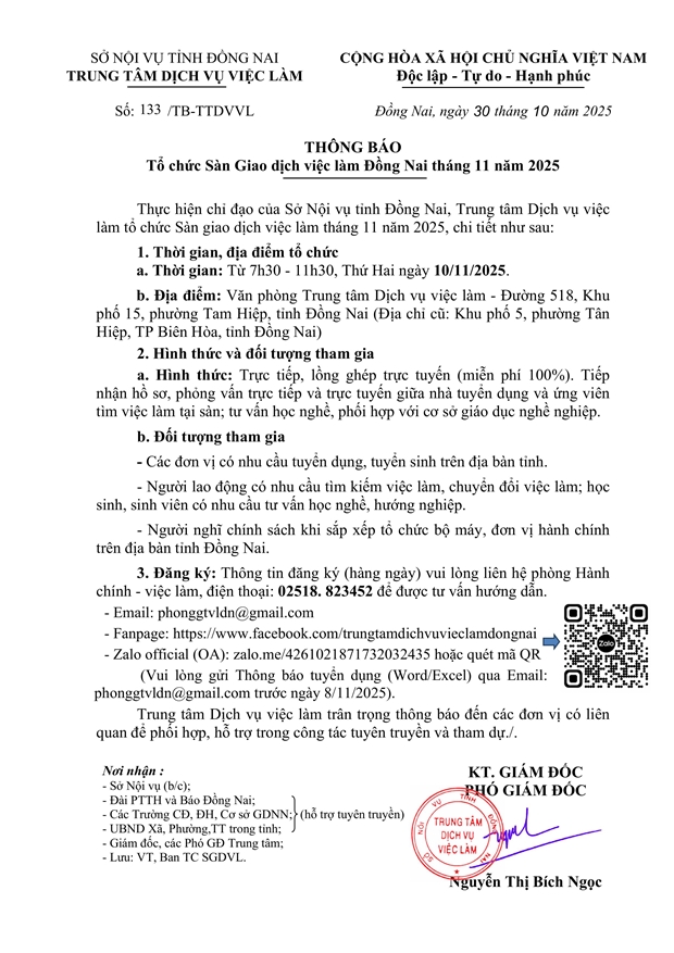 Thông báo và Thư mời tham dự Sàn giao dịch việc làm Đồng Nai trong tháng 11 năm 2025