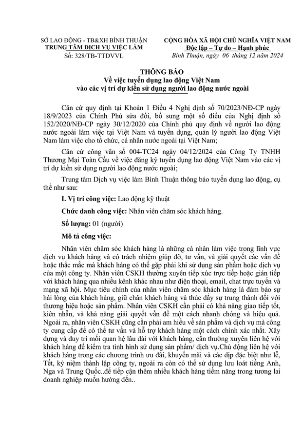 Thông báo V/v giới thiệu, cung ứng người lao động Việt Nam vào các vị trí công việc dự kiến tuyển người lao động nước ngoài (Đơn vị tuyển dụng: CÔNG TY TNHH THƯƠNG MẠI TOÀN CẦU tại tỉnh Bình Thuận - Địa điểm làm việc: tỉnh Bình Thuận).