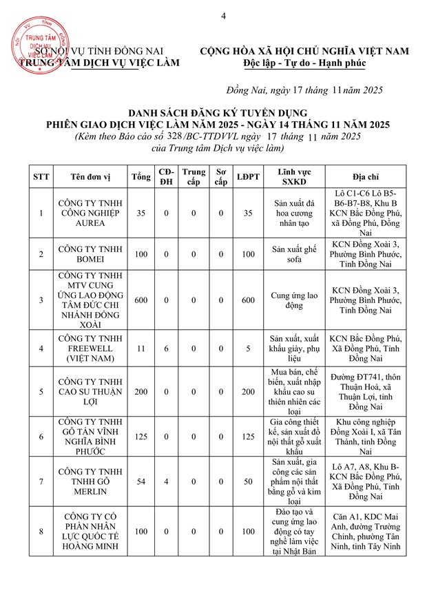 Thông tin hoạt động Phiên giao dịch việc làm năm 2025 trên địa bàn xã Đồng Phú, tỉnh Đồng Nai