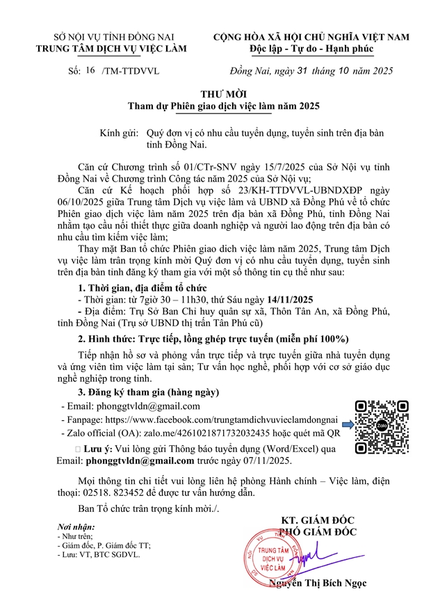 Thư mời Tham dự Phiên giao dịch việc làm năm 2025 tại xã Đồng Phú, tỉnh Đồng Nai