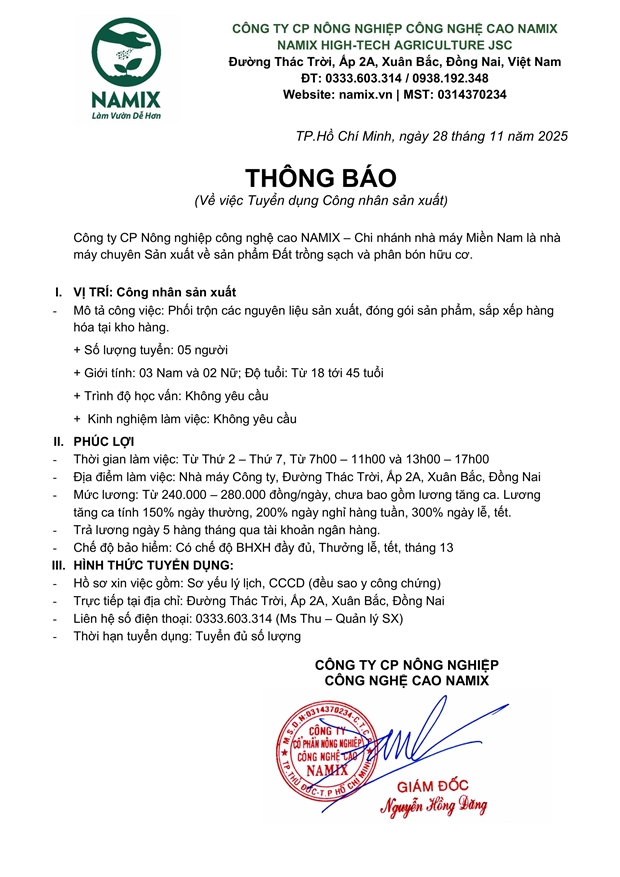 Infographics - Thông tin tuyển dụng từ doanh nghiệp (Nhà tuyển dụng: CÔNG TY CP NÔNG NGHIỆP CÔNG NGHỆ CAO NAMIX).