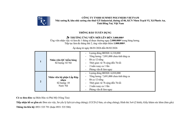 Infographics - Thông tin tuyển dụng từ doanh nghiệp (Nhà tuyển dụng: CÔNG TY TNHH SUMMIT POLYMERS VIETNAM).