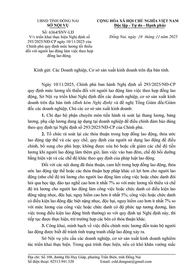 Công văn số 6364/SNV-LĐ ngày 19/11/2025 của Sở Nội vụ tỉnh Đồng Nai