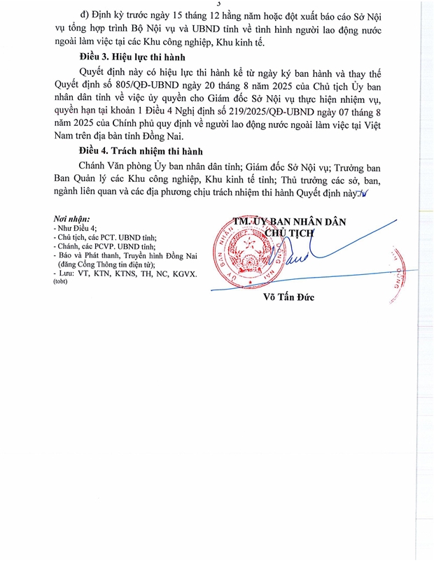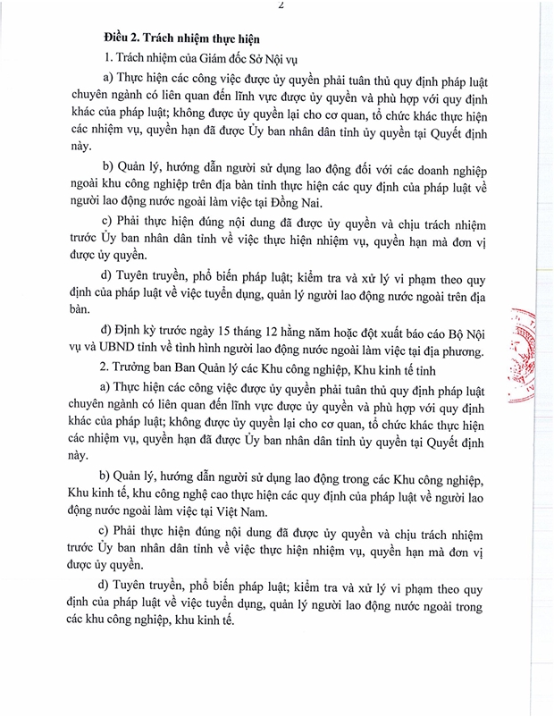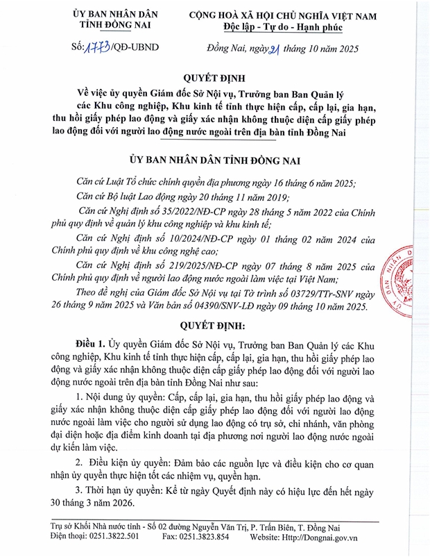 Về việc ủy quyền Giám đốc Sở Nội vụ, Trưởng ban Ban Quản lý các Khu công nghiệp, Khu kinh tế tỉnh thực hiện cấp, cấp lại, gia hạn, thu hồi giấy phép lao động và giấy xác nhận không thuộc diện cấp giấy phép lao động đối với người lao động nước ngoài trên địa bàn tỉnh Đồng Nai.