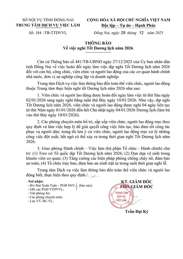 Thông báo về việc nghỉ Tết Dương Lịch 2026