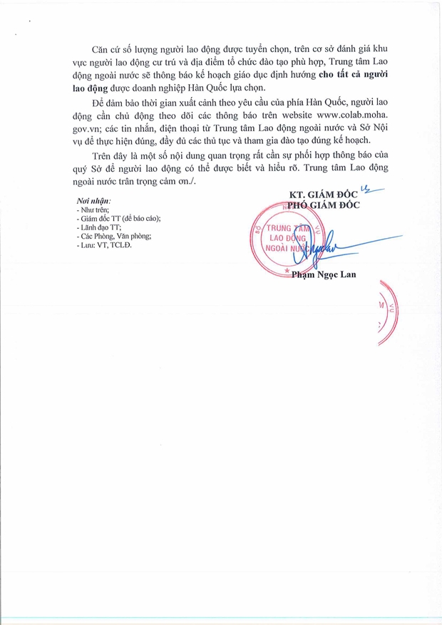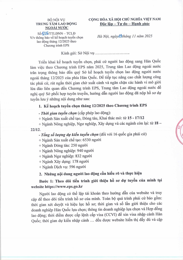 Công văn số: 1206/TTLĐNN-TCLĐ ngày 19/11/2025 của Trung tâm Lao động Ngoài nước